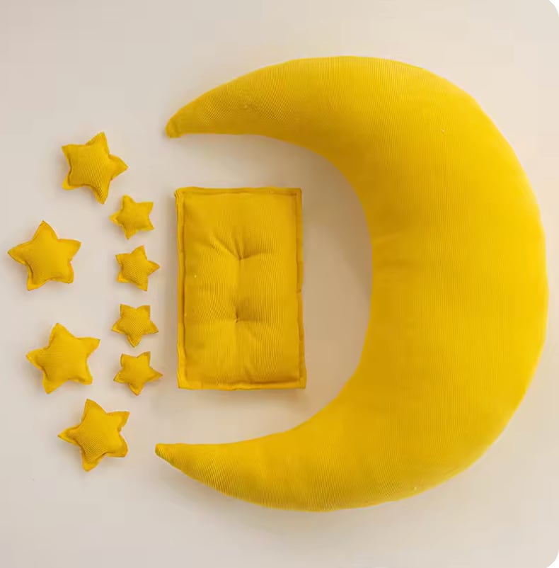 ふわふわで柔らかな素材感が特長なムーンと小さな星4個と少し大きめの星4個、そして枕1つがセットになったお得で可愛いニューボーンフォトのpropsです。