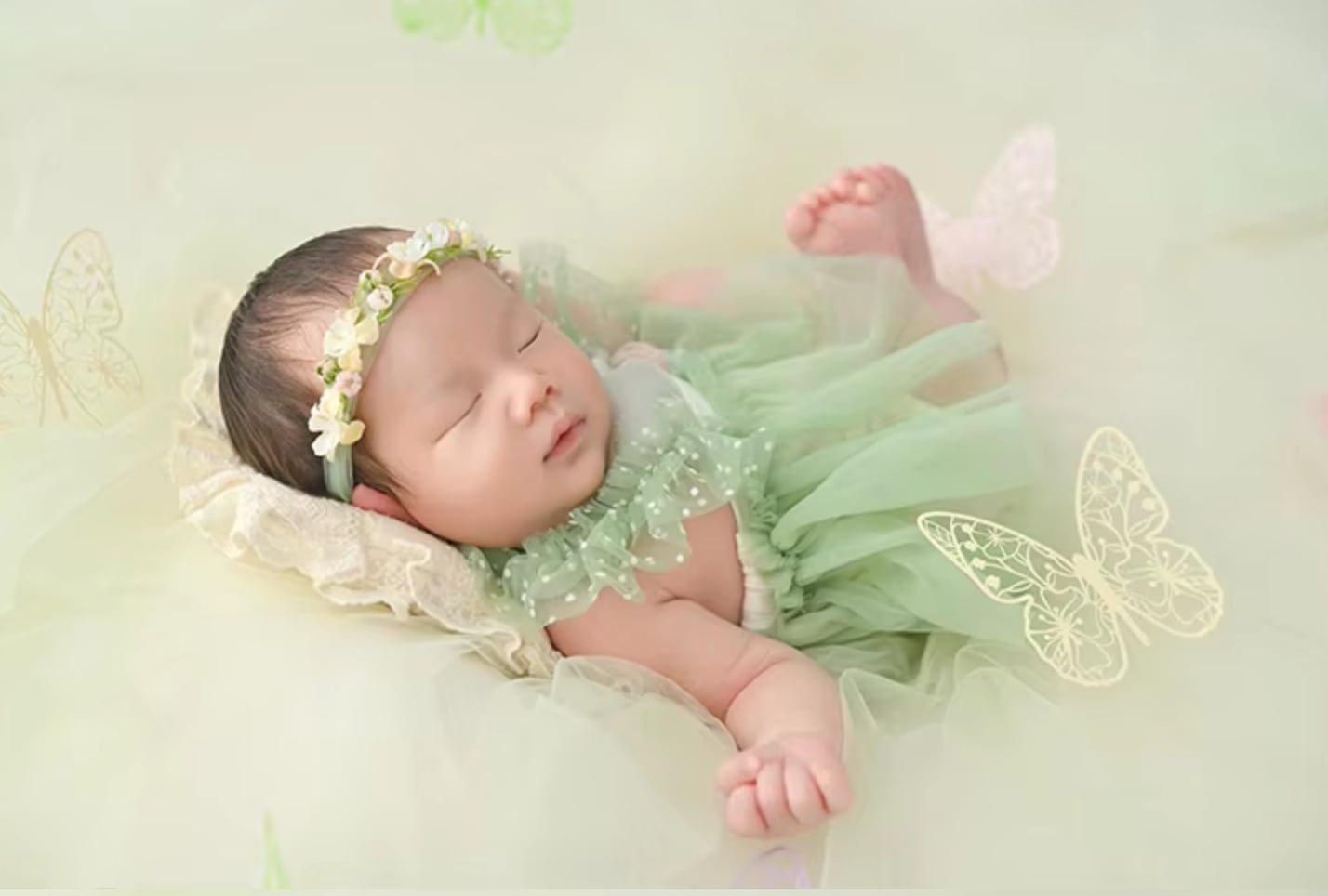 春カラーのグリーンが美しく、ふんわりとしたチュール素材が、まるで妖精のような可憐な印象を与えます。